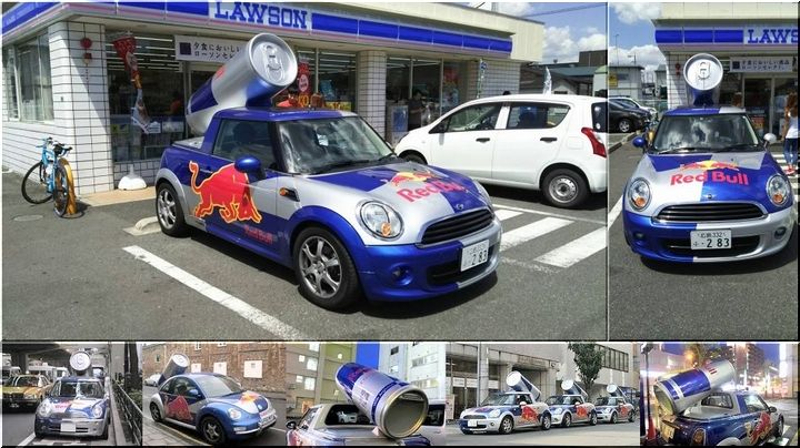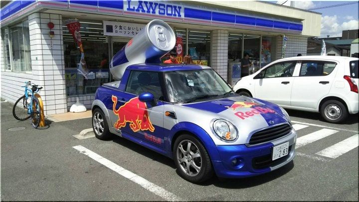 車を駐めスグに眼に入りましたのが、ローソン入り口前駐車場に駐めてあります「Red Bullの宣伝カー」。