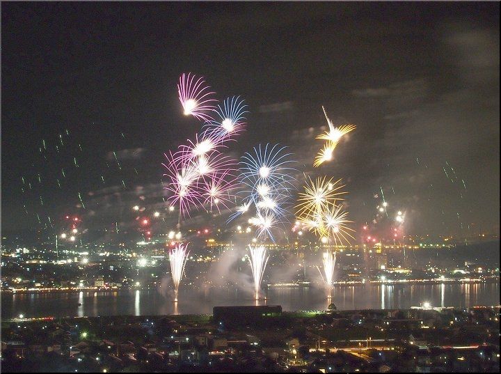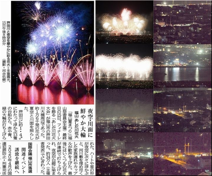 幼少時より慣れ親しみました、毎年8月15日に開催の芦田川花火大会。お盆の送り火として始まったと亡き祖母から教えられたような…草戸大橋より少し上流での開催が永年続いてきましたけど、2007年8月に現在地の芦田川大橋上流に開催場所を変更。この年のみ開催日は8月12日の日曜日。既に丁度丸10年経てしまいました。
