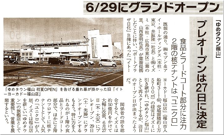 イトーヨーカドー福山店の跡地は「ゆめタウン福山」として再スタートは、知ってはおりましたけど、6/29(土)に決まりましたようですネ(^.-)☆