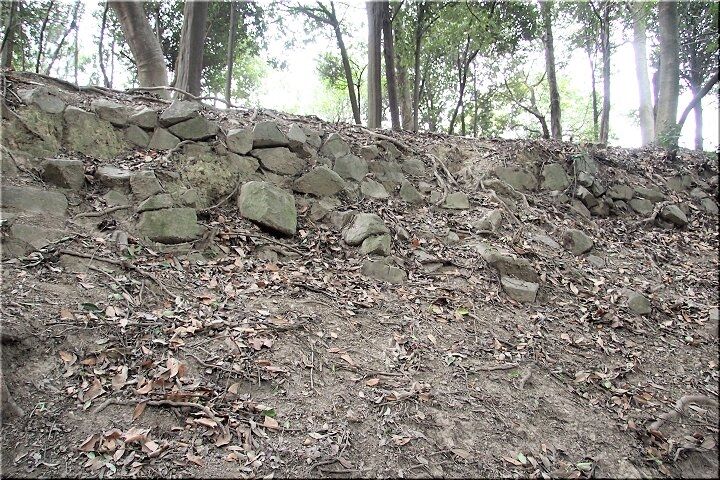 東尾根に配された曲輪群は北側に土塁が残り、南側は石垣が部分的に残っている。ここから登城路とされる竪堀を狙うのは容易である。