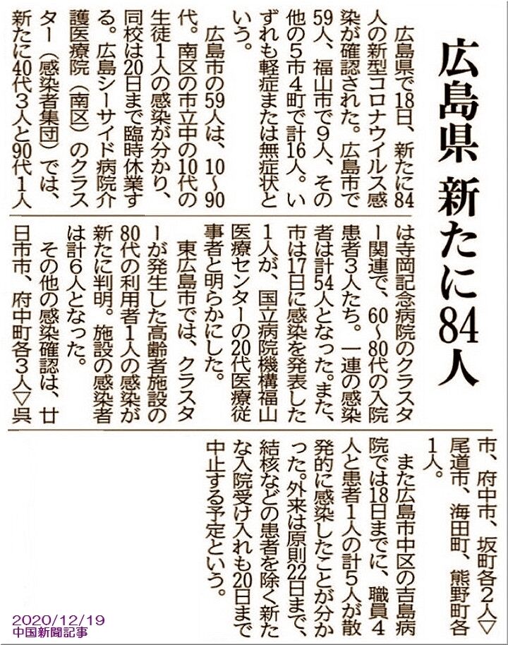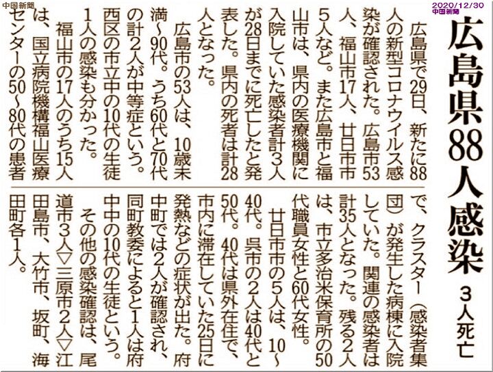 ◆【速報】広島県福山市で1人死亡 9人感染、うち8人は福山医療センターのクラスター関連 新型コロナ