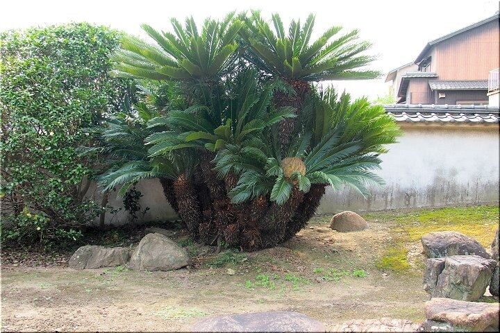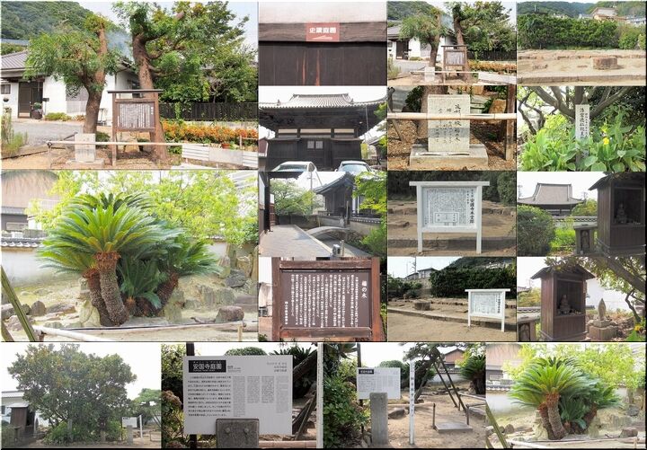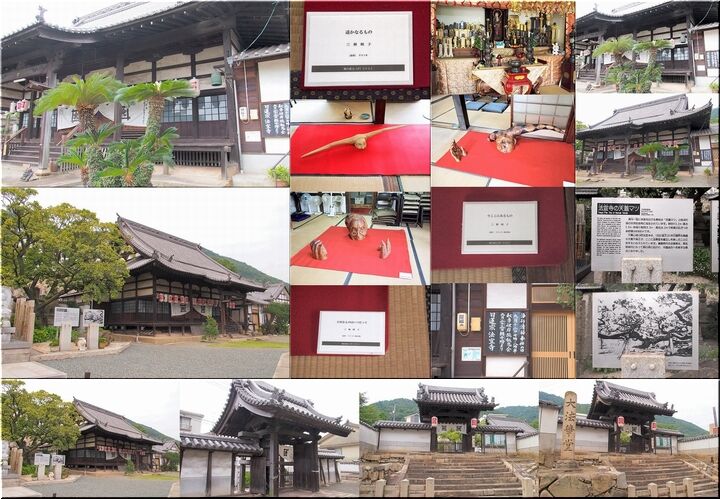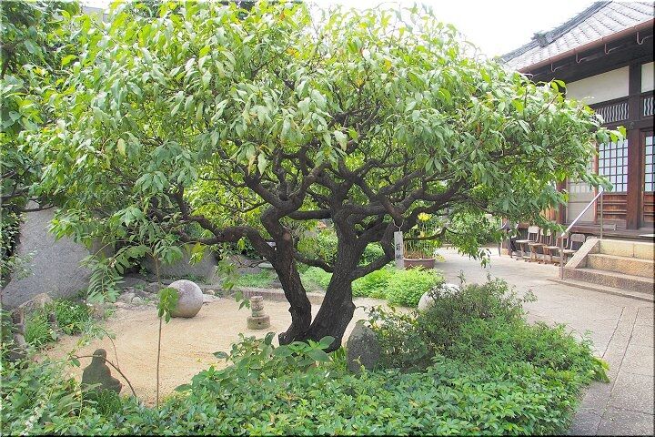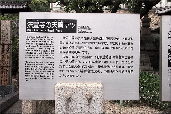 かつて法宣寺には国の天然記念物がありました。大覚大僧正お手植えと伝わる黒松の巨木です。その枝ぶりから「天蓋マツ」とも呼ばれ、鞆の浦の人々の誇りでしたが、残念ながら、1991年夏、六百余歳で枯死しました。支柱と切株だけが残った跡地は、無常の想いを呼び起こします。ただ不思議なのは、老松が枯れて以来、今まで影が薄かった隣の紅梅が生気を得て、最近では新しい花の名所になっていることです。往く者あらば来る者あり。春の境内でそんな感慨にひたるのも「あり」かもしれません。