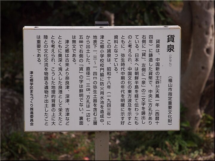 それから、津之郷小学校方向に進んで行きますと、小学校敷地内に、「福山市史跡 本谷弥生遺跡」と「貨泉(福山市指定重要文化財)」の案内表示板が…案内板には、こんな記載がありました(^.-)☆
