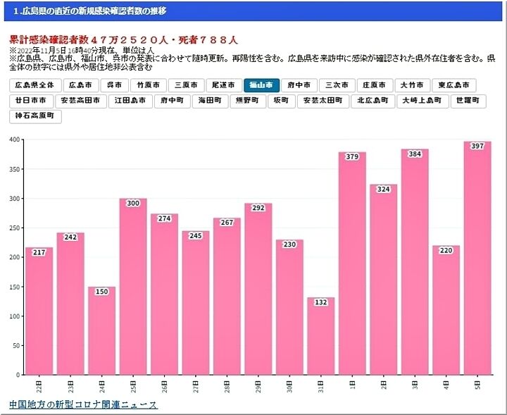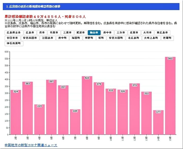 昨日の福山市の感染者発生は、563人で、県全体では、3,460人。土・日曜日明けの月曜日には毎週多いのですけど、県全体で見ますと、前週対比で+545人。3,000人を越えますのは、9月14日以来とか。