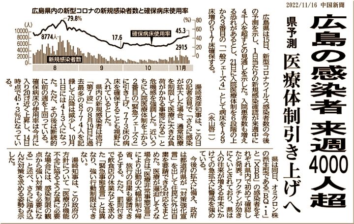 こんな中、本日の中国新聞sanの朝刊は記事によりますと、広島県内の新たなコロナ感染者発生は、来週は4,000人超が見込まれますとか…