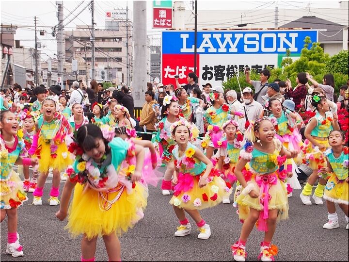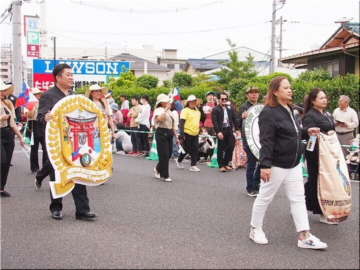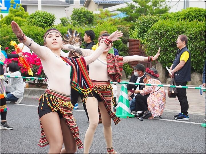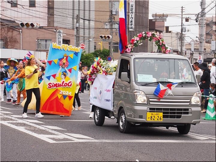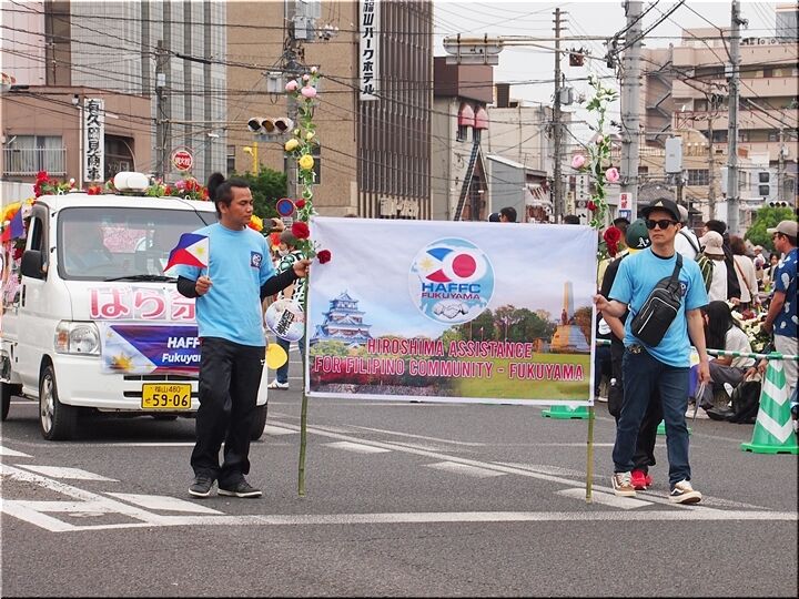 ローズパレードには33団体の計約1,700人が参加した。フィリピンのダンスチーム「HAFFC―FUKUYAMA」は初めての出場。福山市などに住む計約40人が、羽根飾りや花の刺しゅうを施した色鮮やかな民族衣装をまとい、母国の代表的な祭典「アティアティハン」の舞を軽快に踊った。同市曙町の会社員高木リゼルさん(51)は「初出演にみんなドキドキ。なんとか形になったかな」と笑顔だった。