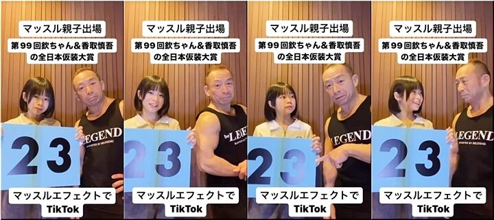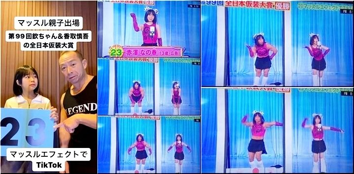この親子は、2024年の仮装大賞で「マッスルエフェクトでTikTok」というパフォーマンスで優勝し、一躍有名になりました。その作品は、SNS上での動画投稿をテーマにしており、特殊効果を駆使して筋肉隆々の姿を演出する内容でした。親子の息の合ったダンスと予想外の展開が高い評価を受け、20点満点での優勝に輝きました。