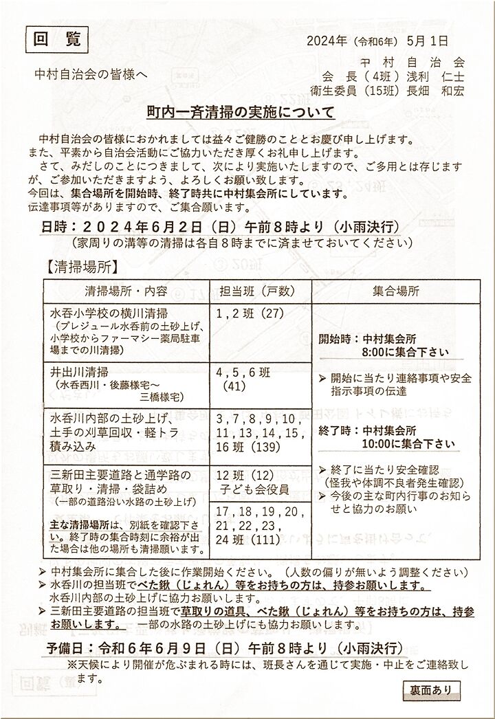 まず定刻に集会所に集合し、自治会長sanより伝達事項。そして、一斉に各部署に分かれて清掃スタートとなりました(^_^)v