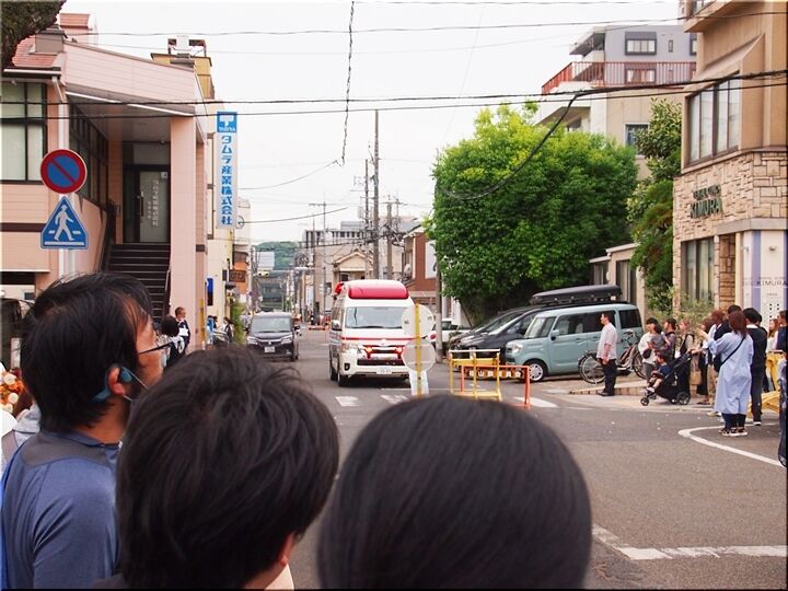 GONsanの前を〝かなりや幼稚園〟の皆さんが通過され、〝俄嘉屋〟の皆さんがヤッて来られました時、突然、救急車のサイレン音で後方を振り返りますと、バラ公園近くの市道に停車です。
