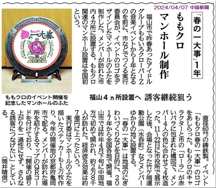 ももいろクローバーZの音楽イベントから、早や1年経ますのですねぇ~これを機に、市などで作る実行委員会が、イベントのロゴをデザインしたマンホールのフタを制作。メンバーの訪れました市内4ヶ所に設置しましたとか。