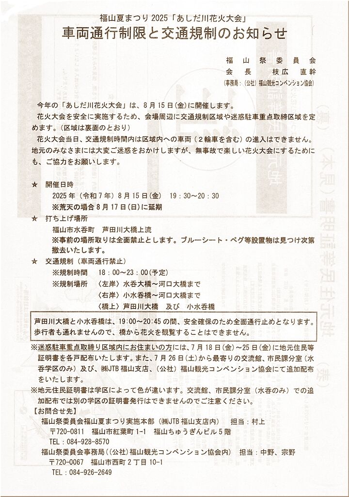 それと、未だ先の事ですけど、〝あしだ川花火大会〟開催に伴う「車両通行制限と交通規制のお知らせ」です。〝あしだ川花火大会〟は、毎年お盆最終日の8/15に行われますから、今年は金曜日となりますネ。