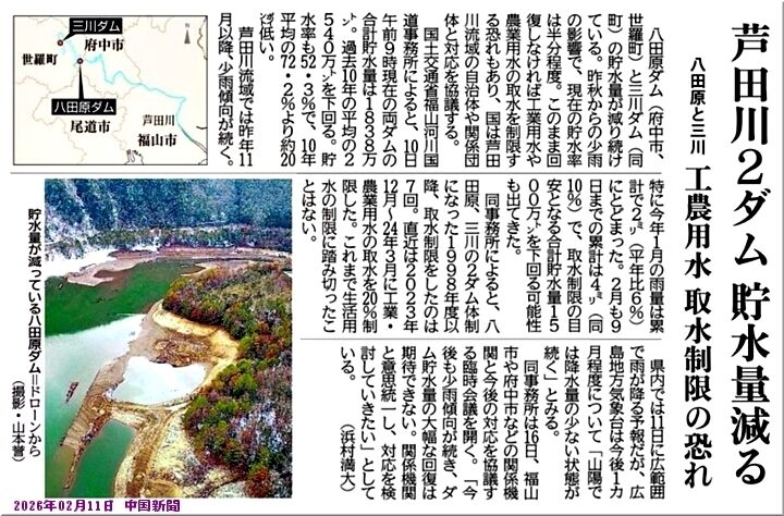 備後地方は昨秋から少雨で、本年に入りましてもほとんど降雨がありませんでしたから、福山市の水瓶であります〝八田原ダム〟〝三川ダム〟2ダムの貯水量が減り続けておりまして、このまま回復しなければ工業用水や農業用水の取水制限の恐れもありますとか…