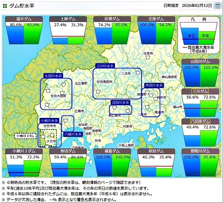 国土交通省福山河川国道事務所によると、10日午前9時現在の両ダムの合計貯水量は1,838万トン。過去10年の平均の2,540万トンを下回る。貯水率も52.3%で、10年平均の72.2%より約20ポイント低い。