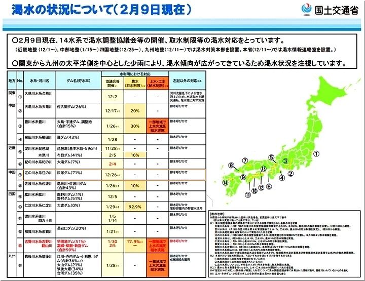 芦田川流域では昨年11月以降、少雨傾向が続く。特に今年1月の雨量は累計で2ミリ(平年比6%)にとどまった。2月も9日までの累計は4ミリ(同10%)で、取水制限の目安となる合計貯水量1,500万トンを下回る可能性も出てきた。