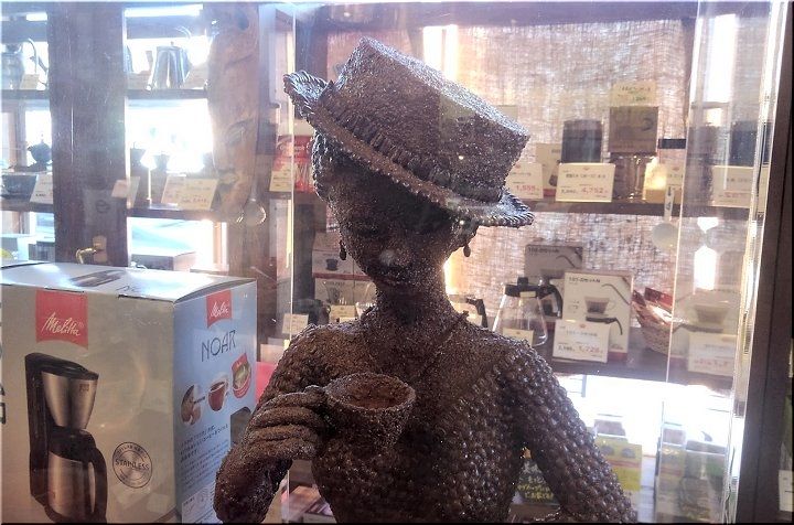 挿入画像の女性像…これはコーヒー豆での創作ですけど、店内に入りますと1組先客が空席待ち。