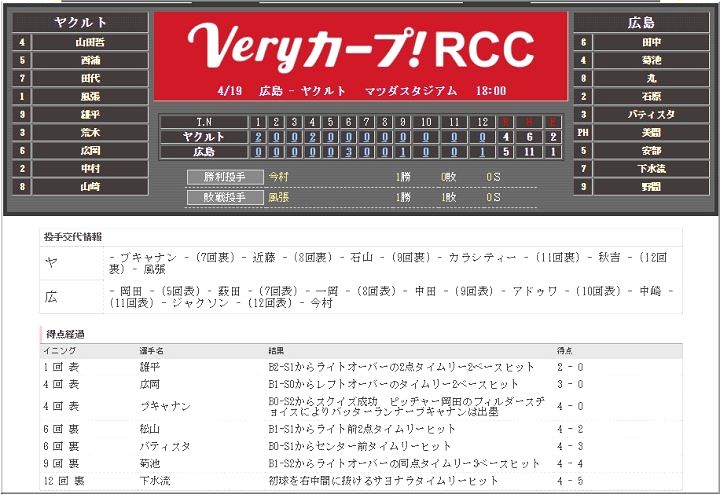 ◇セ・リーグ 広島5×4ヤクルト(2018年4月19日 マツダ)