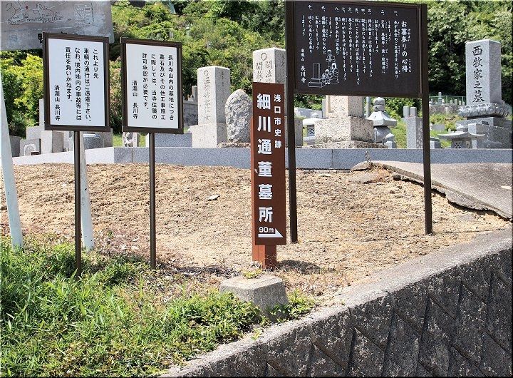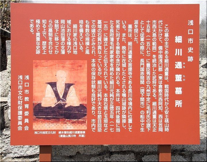 このご縁から長川寺には細川通董公の肖像画と墓所が浅口市指定の文化財として現存しています。細川通董公は戦国大名毛利氏の客将として足利義昭等と親交を結び、この地で存在感を増しましたが、豊臣秀吉の九州征伐から帰国中の天正15年(1587年)に赤間関(現下関市)で病没されました。