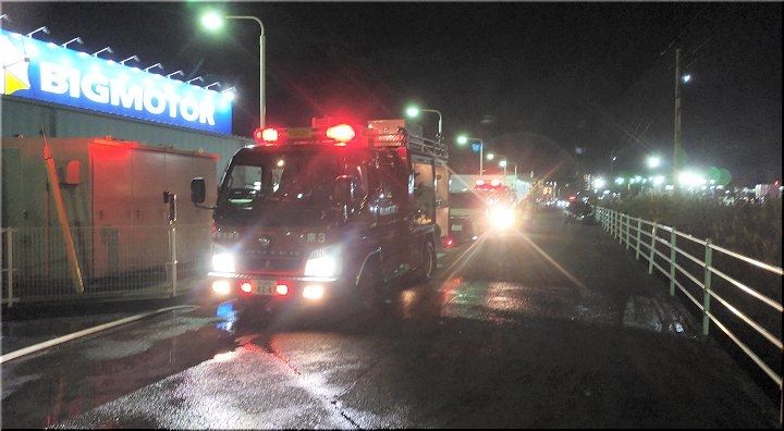 そうしますと、ビッグモーターsan付近にパトカーと消防車が停止中。