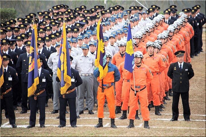 徒歩部隊・車両部隊の分列行進が終わりますと、国旗掲揚・黙とう・式辞・訓示・表彰…と、続きます。