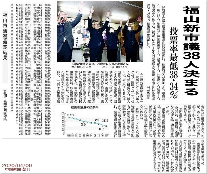 福山新市議の38名が決まり、今朝の中国新聞sanの朝刊には、当選者の皆様の顔ぶれ、そして、最終得票数の結果発表がありました(^.-)☆