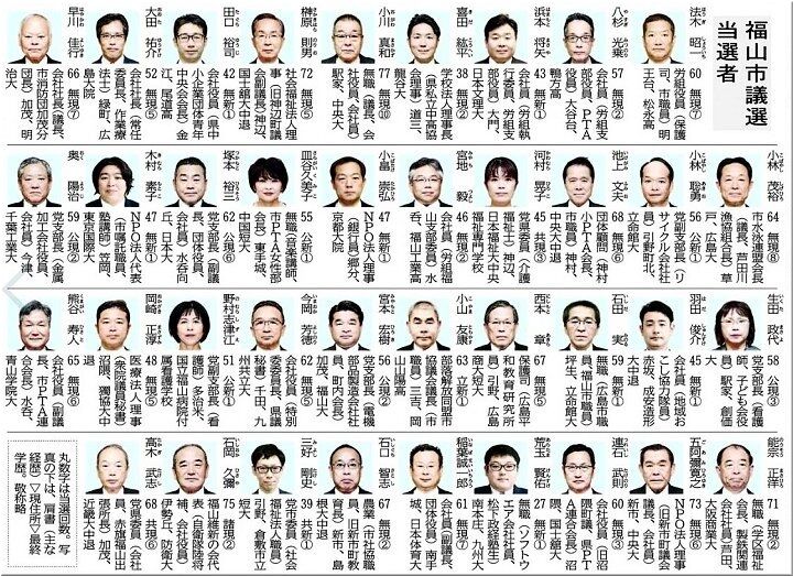 当選されました新市議の皆様には、福山市の一層の発展に向け、ご尽力下さいますよう切にお願い申し上げたいと思います(^-^)//"