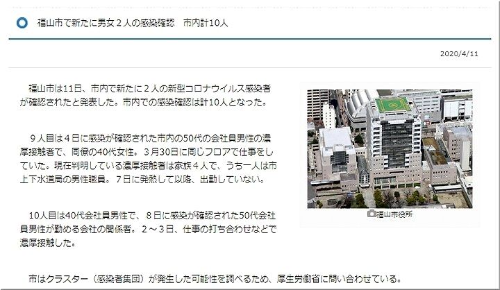 つぃさっき、WEB上で「本日の福山市の新型コロナウイルス感染者」を検索しましたら、こんな記事の掲載が…