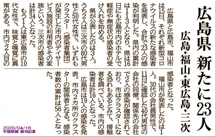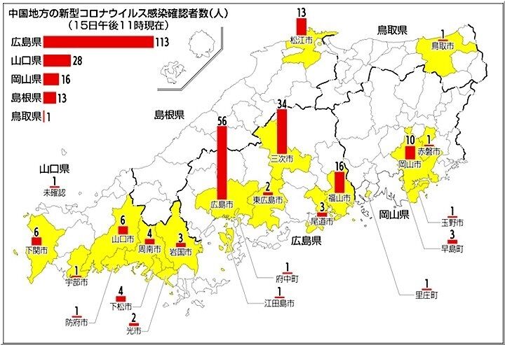 県内では、前日対比で23名の増加。昨日時点で広島県内では113名の感染者と言う事になりますネ。中国新聞sanの「中国地方の新型コロナウイルス感染者確認数」によりますと、中国5県では広島県が最も多い現状です。