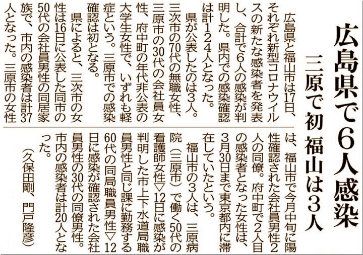 今朝の中国新聞sanの朝刊から、また、新型コロナ関連の情報を拾ってみますと、う~ん、昨日も福山市内では新たに3名の方が感染確認となりましたか…