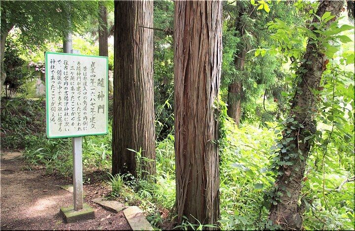 隋神門は、瓦葺で三間一戸の八脚門である。貞亨4年(1687年)に建立されたと伝えられ、建物の様式からもその時の建立と考えられる。また、神像が2組残っており、記述とおり以前は随身門が2か所あったと思われる。