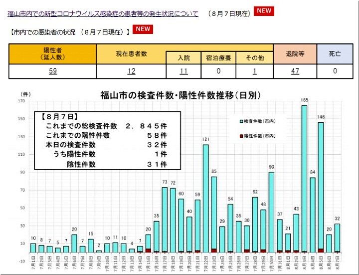 福山市は7日、新型コロナウイルスの感染者1人が確認されたと発表した。市内での感染者は再陽性を除き、57人目。