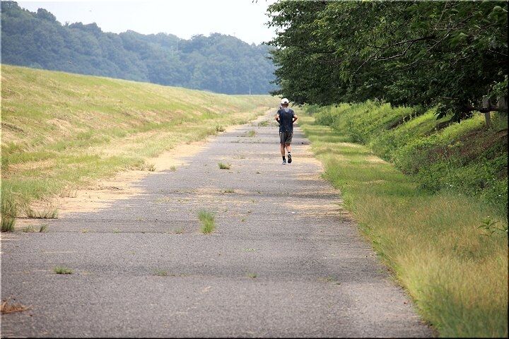 「かさおか太陽の広場」と土手との間には、一直線の道が平行して南端まで続きますけど、土手からこの道に下りて来ますと、前方にスロージョギングをしておられます男性が…