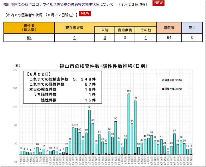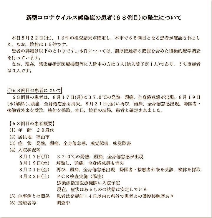 …との事で、福山市のホームページを確認しますと、昨日(8/21)に30代の再陽性者、本日、20代の感染者が発生しましたようです。