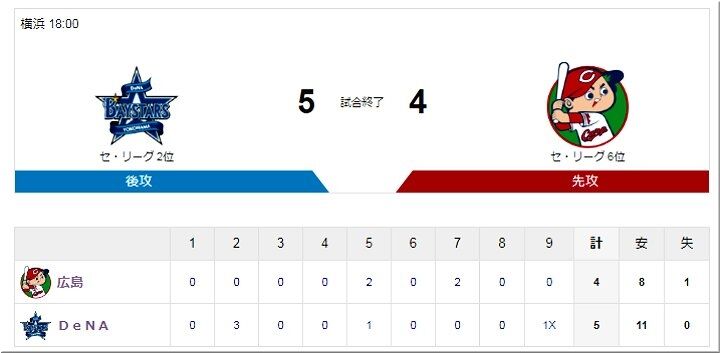 DeNAが劇的なサヨナラ勝利。DeNAは2回裏、宮崎の2ランなどで3点を先制する。その後4-4で迎えた9回には、2死一二塁から大和が適時打を放ち、試合を決めた。投げては、6番手・三嶋が今季初勝利。敗れた広島は、5番手・塹江が踏ん張れなかった。