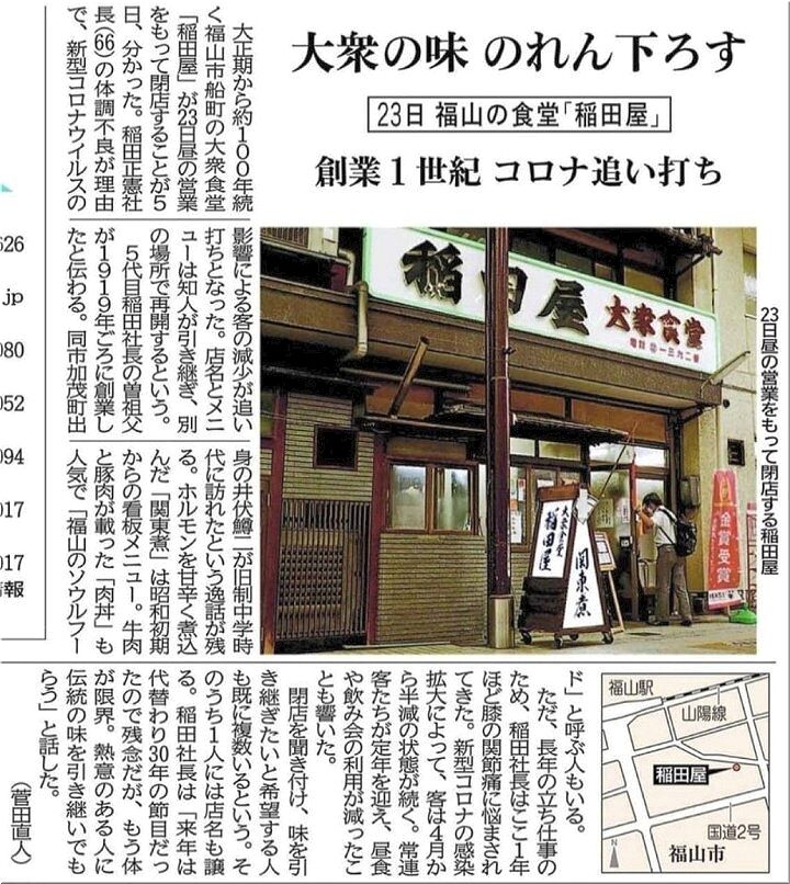 これは、今朝の中国新聞sanの記事なんですけど、ふ~ん、永年親しんで来ました「稲田屋」san…今月23日限りで閉店されますようですねぇ~