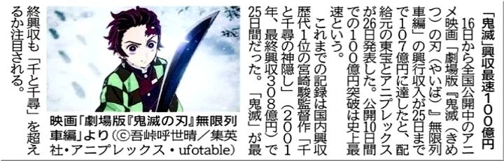 これは、10/27(火)の中国新聞sanの朝刊記事なんですけど、アニメ映画「鬼滅の刃(無限列車編)」の興行収入が10/16~10/25間で107億円に達しましたとか…