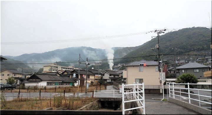 なのに、正面方向の水呑小学校後方辺りから、風がありませんから真っ白い煙が真っ直ぐに上がっておりました。こんな雨の中で、何を燃やしておられますのでしょうねぇ~