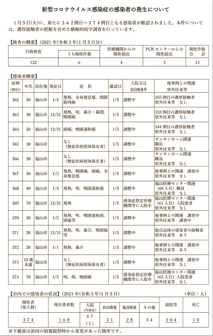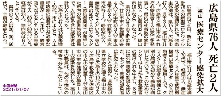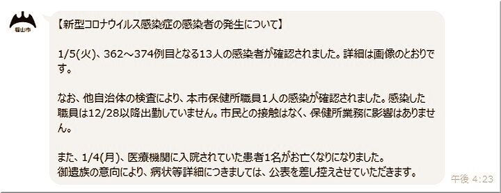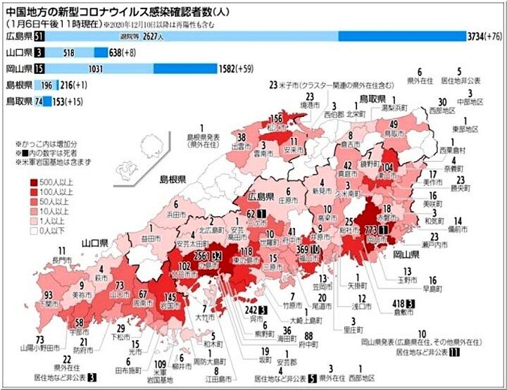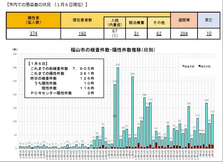 昨日の福山市の発表、そして本日の中国新聞sanの朝刊記事によりますと、福山市では、結局、1/5(火)の新たなコロナ感染者は13名のようですネ。