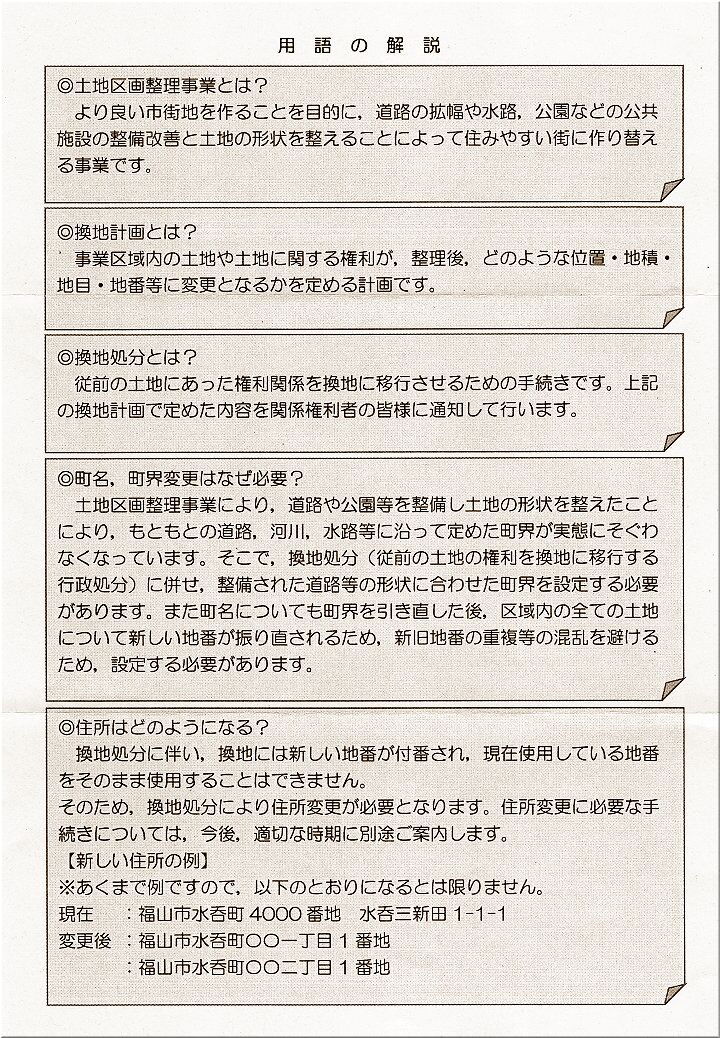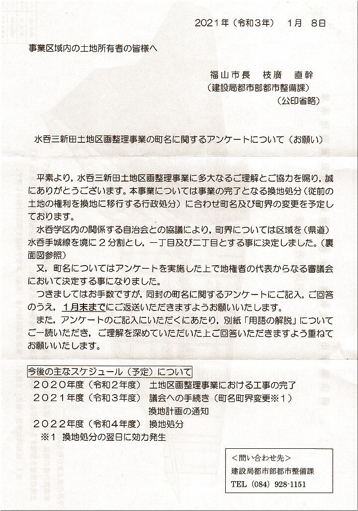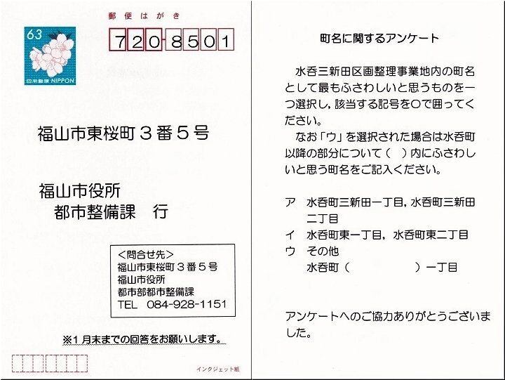 『福山市 都市部 都市整備課』からの郵便物は、開封してみますと、やはり町名変更にかかるアンケートでありました。
