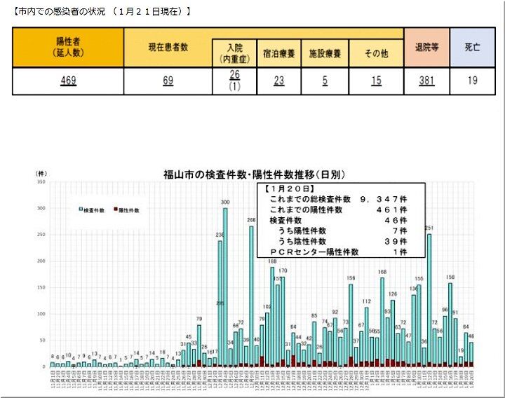 市によると、市内で初めて感染が確認された昨年4月2日から1月19日までの感染者は延べ461人。このうち、昨年11月24日以降の感染者が379人で、8割以上を占める。福山医療センター(沖野上町)や寺岡記念病院(新市町)、事業所などで発生したクラスターの影響が大きく、院内感染だけで155人と約4割に上る。飲食店や職場から家庭に持ち込まれたケースも目立つ。