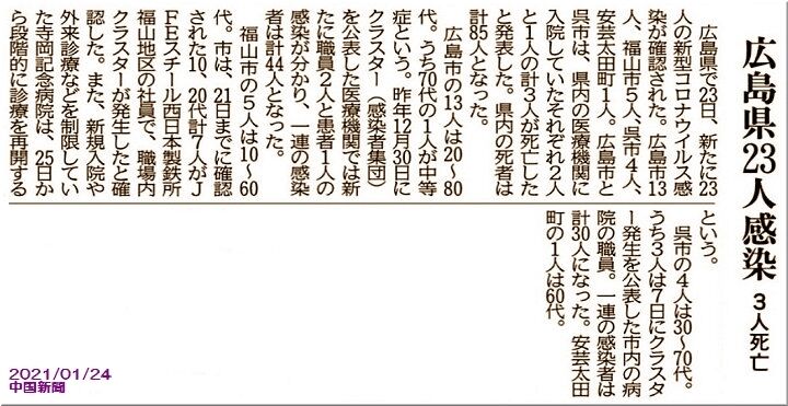 ◆広島県内、23日は23人感染3人死亡 福山のJFEでクラスター 新型コロナ