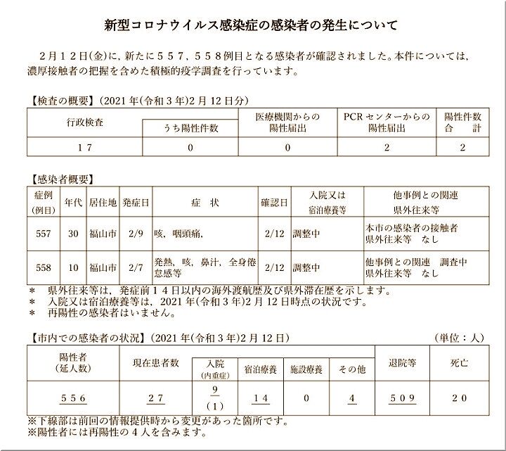 2/12(金)、557・558例目となる2人の感染者が確認されました。詳細は画像のとおりです。