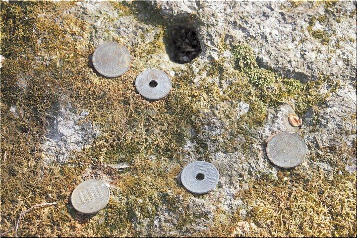 金魚岩の眼の辺りには、100円・10円・5円等の硬貨のお供えが…地元の方…訪れました方…どなたか分かりませんけど、心ある方のお供えなのでしょうネ。