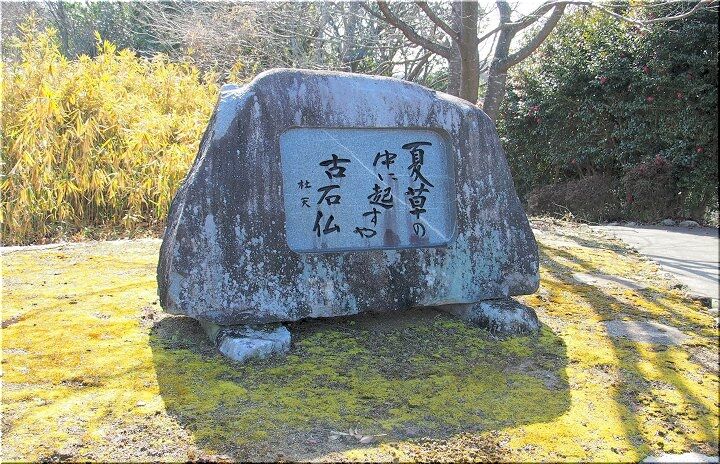駐車場の一角には、『夏草の 中に起すや 古石仏 - 杜天』と刻まれました句碑が…