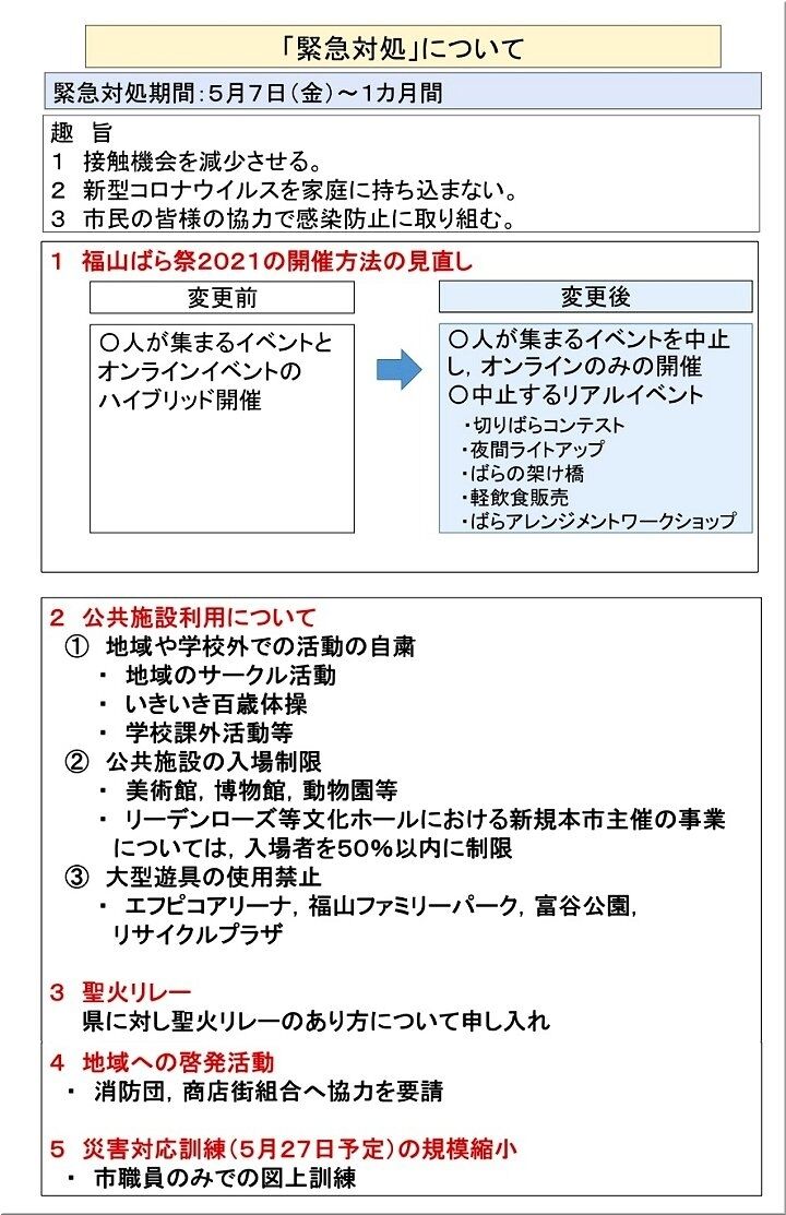…と、こんな福山市の状況ですから、現在の取り組みの『4/29~5/16までの「取組集中期間」』を、『本日・5/7(金)から1カ月間を新たに「緊急対処期間」』として、集中的に取り組まれるようであります。