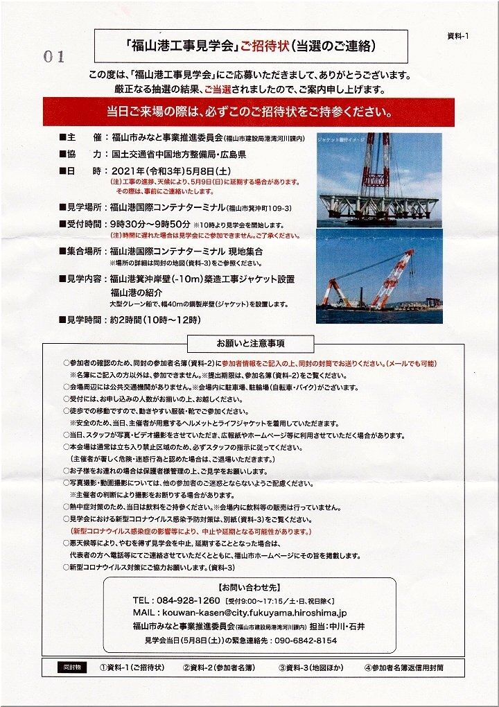 「んっ!?…何で福山市から電話が…」と不思議でしたが、内容は「福山港工事見学会の中止」の連絡だったとの事でした。