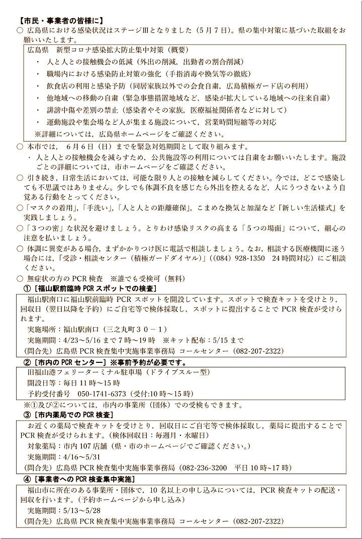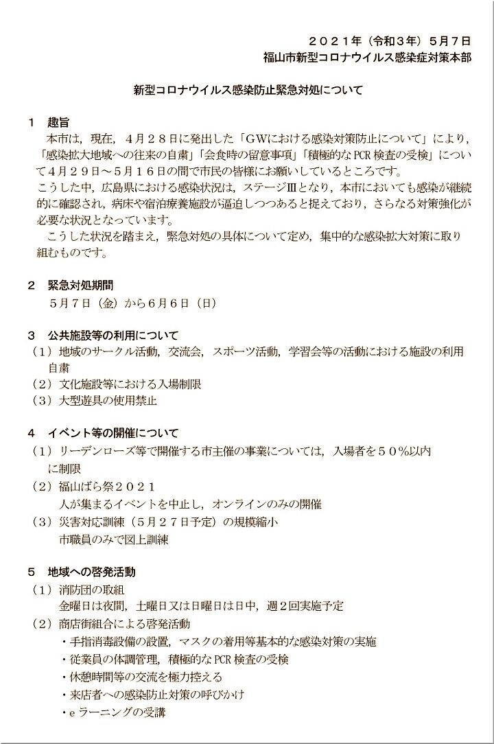 福山市でも依然として、連日10人を越えます感染者が確認されております。