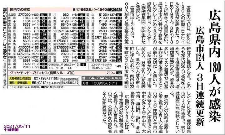 広島県では、昨日(5/10)は新たに1/0人の新型コロナウイルス感染が確認され、この180人は3番目に多いとの事であります。