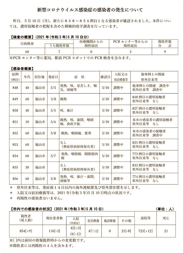 5/10(月)、848~856例目となる9人の感染者が確認されました。詳細は画像のとおりです。