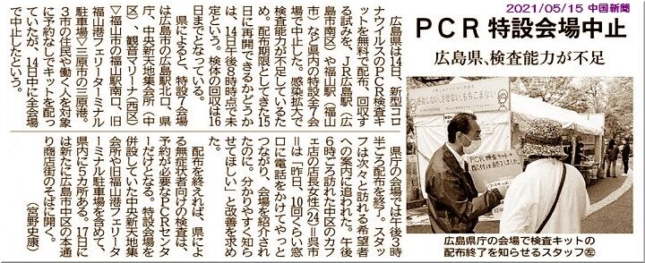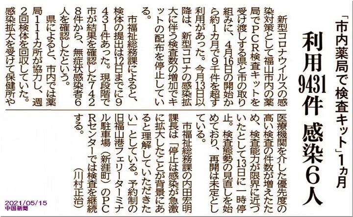 福山市内の処方箋薬局で、無料の新型コロナウイルスPCR検査キットを受け取り、週に2日の指定日に持参し、無料でPCR検査を受検…この制度を利用し、GONsanは先月下旬にPCR検査キットを貰い、5/10に提出。そして、5/12に陰性結果を確認しておりまして、この方法でしたら、市民の皆様も利用し易いイィ制度と思っておりましたけど、感染拡大で検査能力が不足し、5/13以降は検査キットの配布を停止との事。
