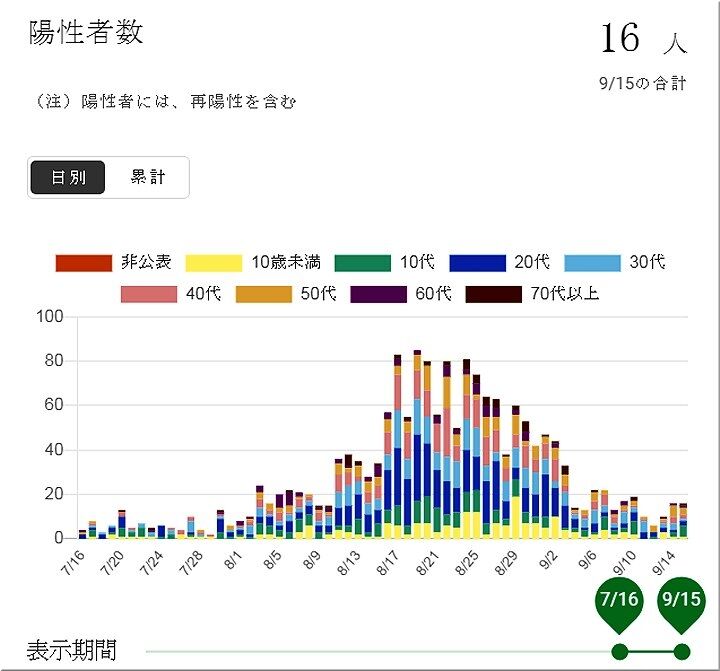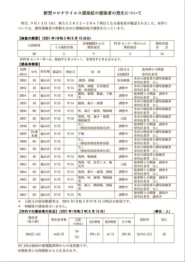 9/15(水)、2852~2867例目となる16人の感染者が確認されました。